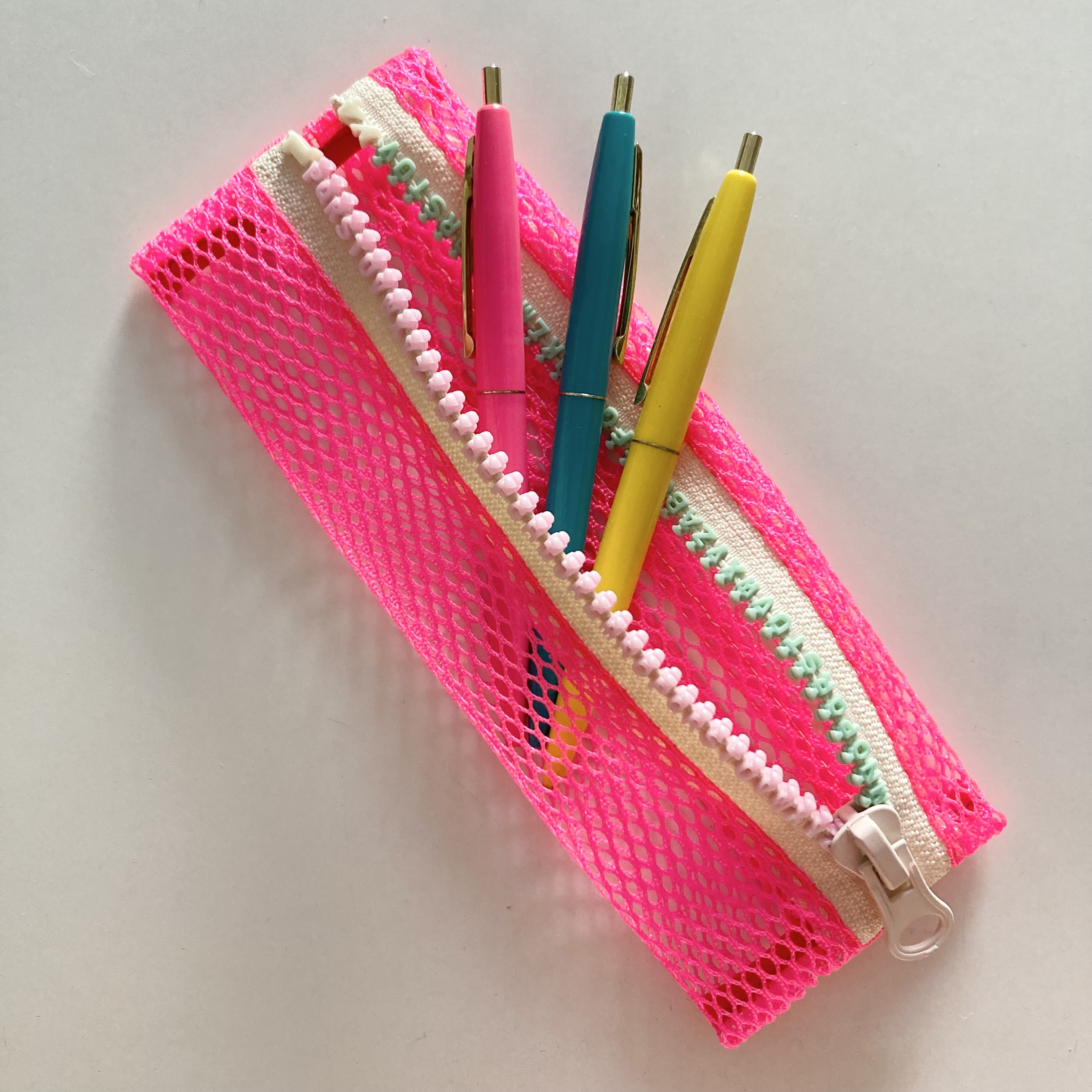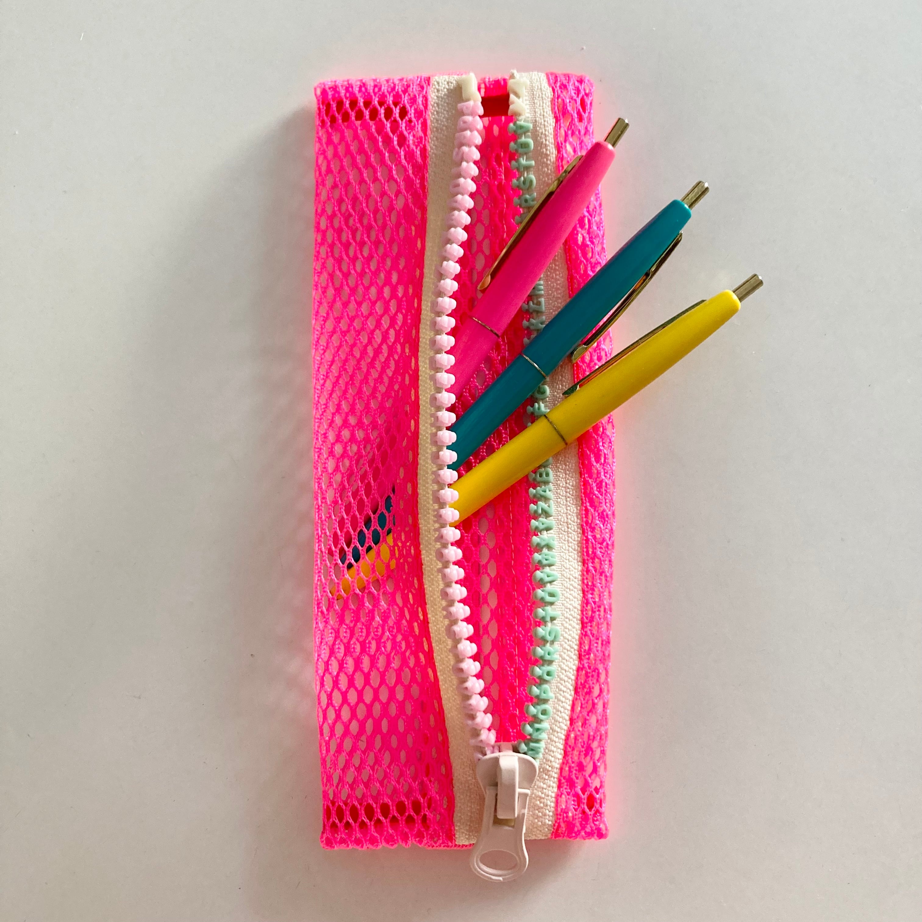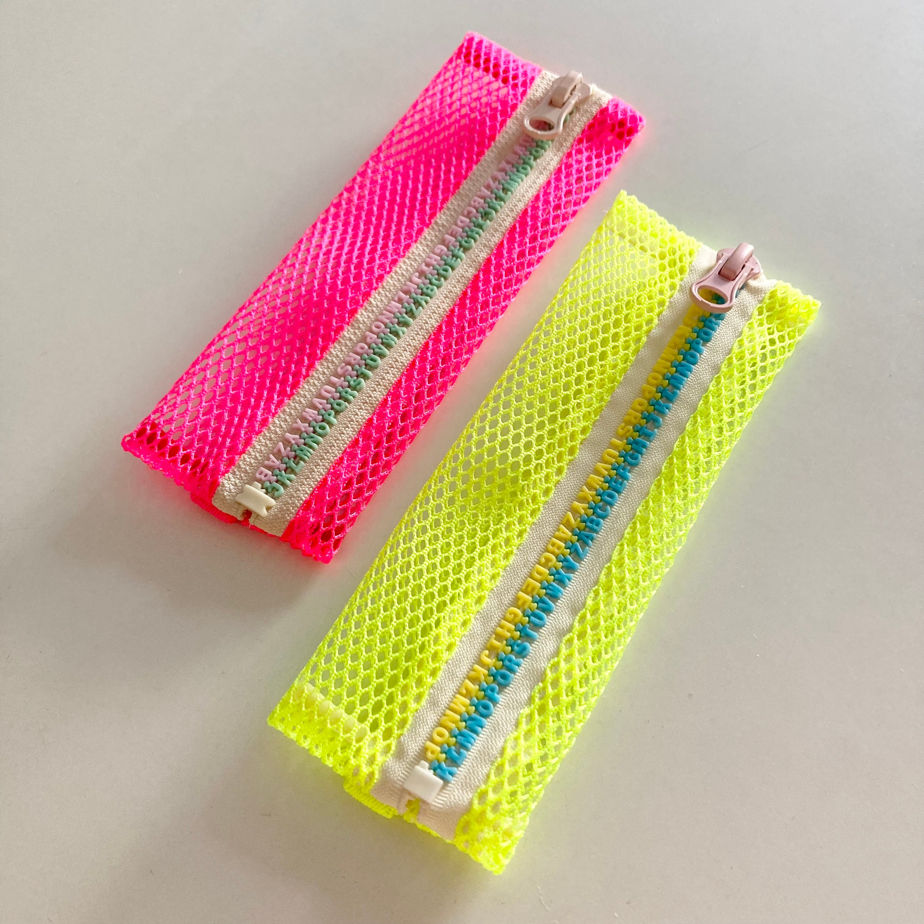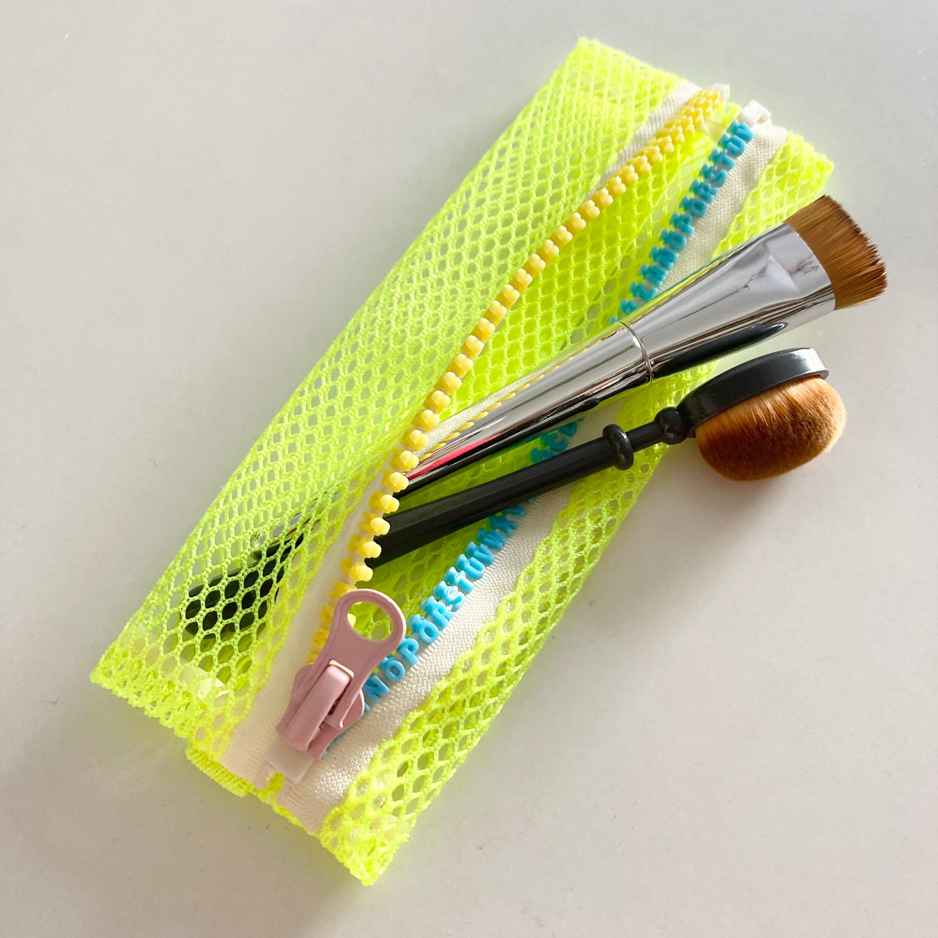 心浮き立つネオンカラーのメッシュ素材を使った軽量かつスリムなペンケース。